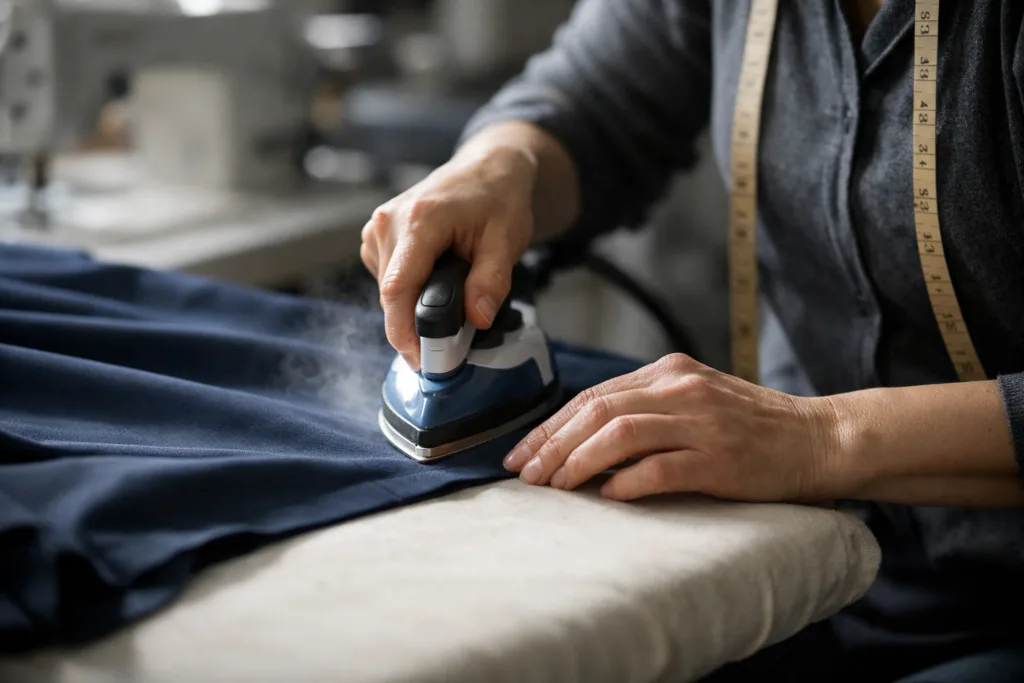 Proper pressing locks your hem in shape before stitching. For crisp hems (skirts, pants), use steam and a pressing cloth. For soft hems (knits, delicate overlays), reduce heat and avoid stretching out the garment as you press.