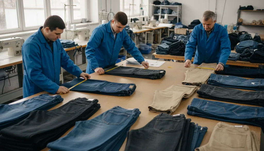 Stretch garments are measured in both relaxed and extended states; denim is measured after washing to account for shrinkage and ensure fit within tolerance.
