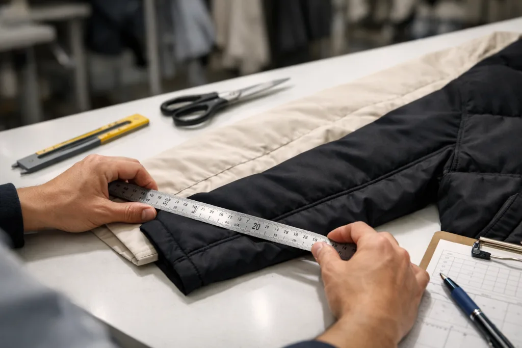 Quality control checks involve measuring sleeves against master samples and tolerances, catching mismatches before garments ship out.
